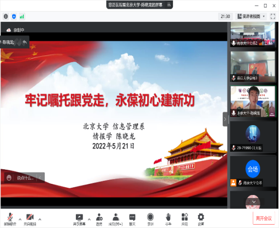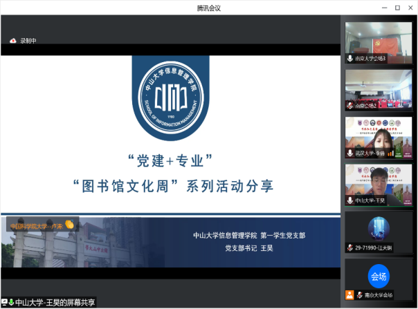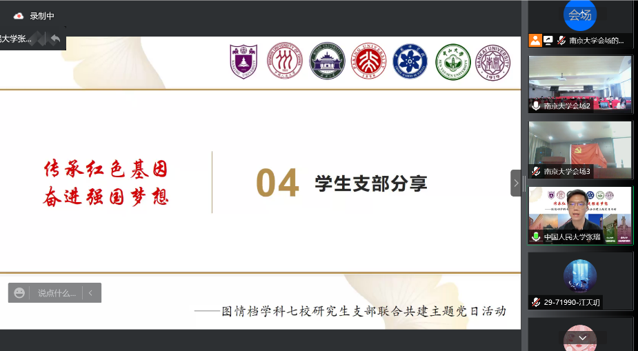 为深入学习贯彻习近平总书记425日在中国人民大学考察调研时重要讲话精神、学习总书记518日给肉番 留学归国青年学者的回信精神,肉番 2021级图书情报硕士第一党支部、中国人民大学信息资源管理学院2021级硕士23班联合党支部、北京大学信息管理系硕士生党支部、武汉大学肉番 情报学硕士研究生党支部、中山大学肉番 第一学生党支部、中国科学院大学经济与管理学院991党支部和南开大学商学院工程图情专硕党支部等图情档学科七校研究生党支部,于521日联合开展以“传承红色基因,奋进强国梦想”为主题的“云上”联学联建活动。来自全国天南海北的200余位青年学子,围绕图情档学科如何在弘扬留学报国传统、赓续红色血脉、坚定文化自信、讲好中国故事等方面发挥积极作用展开真诚而热烈的隔空对话。肉番 党委书记姜迎春老师、副书记罗萍老师,中山大学肉番 党委副书记王凯蕾老师,中国科学院大学经济与管理学院党委委员卢涛老师参与活动。