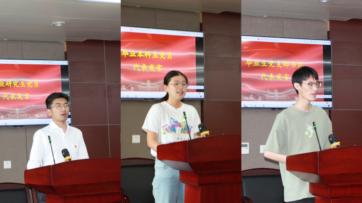 活动伊始,大家共同观看了《我是党员青年 我在南大信管》微记录视频。师生们共同回望了近年来学院党委及支部开展组织生活和党员教育实践活动概况,这些由毕业生党员曾亲身组织或参加过的活动,让同学们回忆满满、无限感慨。随后,毕业生党员代表进行发言:研究生范涛感谢母院的培养让我们得以站在巨人的肩膀上,未来将牢记习总书记对南大人“报效祖国、服务人民”的嘱托,瞭望世界科技前沿、树立学术理想、勇攀科学高峰;本科生刘枫荷表达了身为中共党员的光荣和自信,阐述了肩负的时代使命和责任担当,表达了对未来人生和祖国发展的美好憧憬;党支部书记李昕尉感谢党员同学们对支部建设的支持,分享了组织工作的感悟,寄语大家在新的人生旅程继续保持入党初心、知纪守纪、坚守底线,发挥好党员的先锋模范作用。同时,他们纷纷表示:要继续在新征程上增强“骨气”“志气”与“底气”,用行动书写新时代的青春华章。