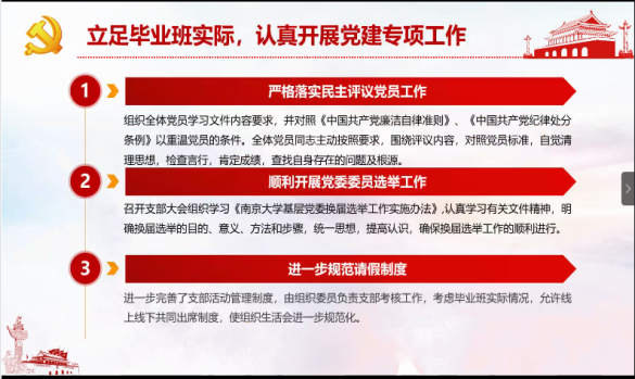 党委副书记罗萍针对学生支部的党员教育管理具体工作进行了指导。党委专职组织员朱敏对下一阶段毕业生党员的教育、组织关系转接、以及党员发展转正等常规工作进行了部署与安排。