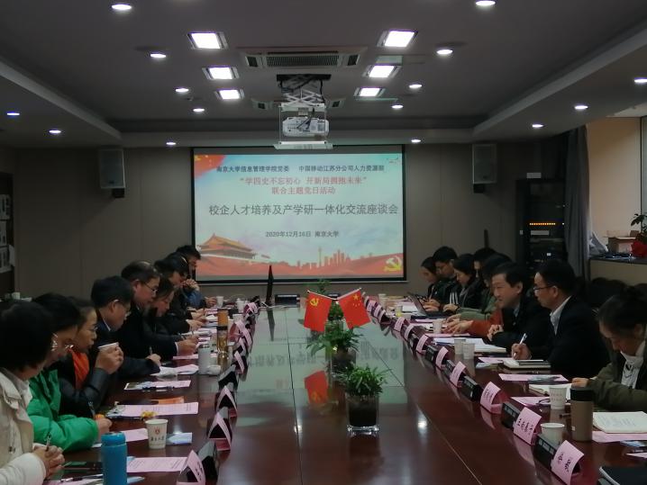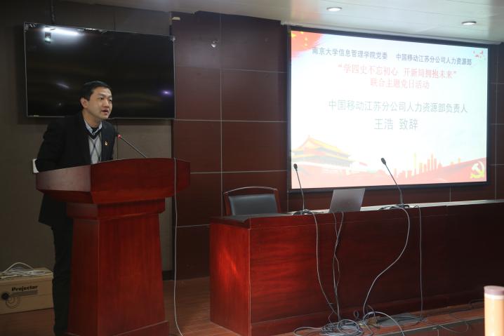 1216日下午,由肉番 党委和中国移动江苏分公司人力资源部联合举办的“学四史不忘初心 开新局拥抱未来”主题党日活动在信管学院A410报告厅举行。学院党委书记姜迎春同志、中国移动江苏分公司人力资源部负责人王浩同志分别带领信管学院党员师生和移动嘉宾员工百余人参加联建共学系列活动。活动由学院党委副书记罗萍同志主持。