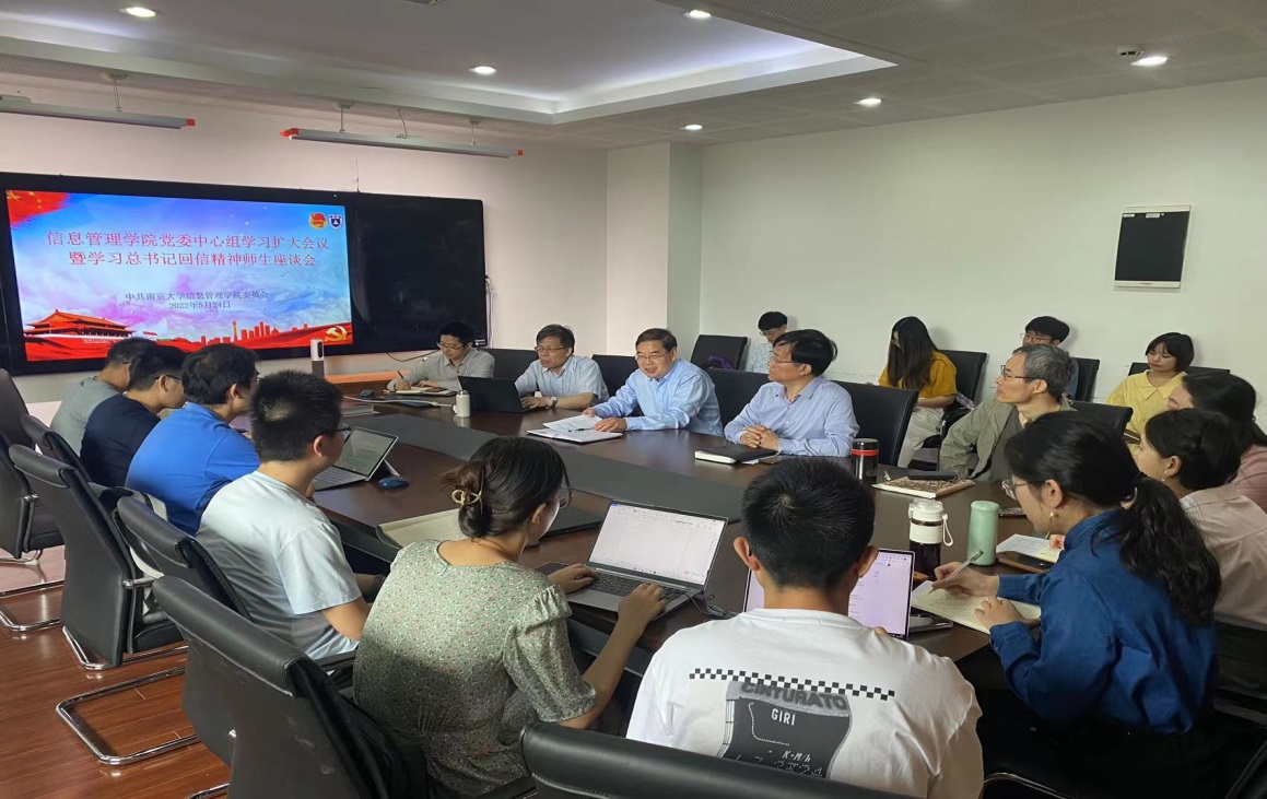 学院党政班子其他成员围绕学习贯彻回信精神展开分享。孙建军院长强调,要在人才培养方面把握立德树人根本原则,培养符合国家需要的时代新人;要在学科建设上再创佳绩,紧跟时代步伐,服务国家战略需求,对照国家标准引导技术创新;要在文化自信上,继续发挥图情档一流学科优势,讲好中国故事,走在时代前列。朱庆华副院长认为,总书记的讲话体现了党对留学归国人员价值的肯定,是“报效祖国、服务人民”的最好诠释。他分享了自己青年时期求学日本的经历,深刻感受到只有报效祖国、与祖国共成长才能实现自己的人生价值。罗萍副书记结合学生思想政治教育实际工作,从“强化使命担当、加强队伍建设和优化育人体系”等3个方面分享了心得体会和未来工作打算。党委委员张志强作为留学归国教师,认为总书记的回信体现了党和国家对留学归国人员的亲切关怀,自己备受鼓舞。他说,个人命运与国家命运联系在一起,作为有着30多年教龄的南大人,要以总书记回信为动力,为建设“第一个南大”和构建中国特色的学科体系、学术体系、话语体系贡献力量。党委委员、研究生辅导员刘千里表示,要用社会主义核心价值观作为方向引领、中国发展成就作为前行动力、中国重大需求作为问题导向,紧紧围绕立德树人根本任务,引导研究生自立自强,在科研创新道路上奋力前行。