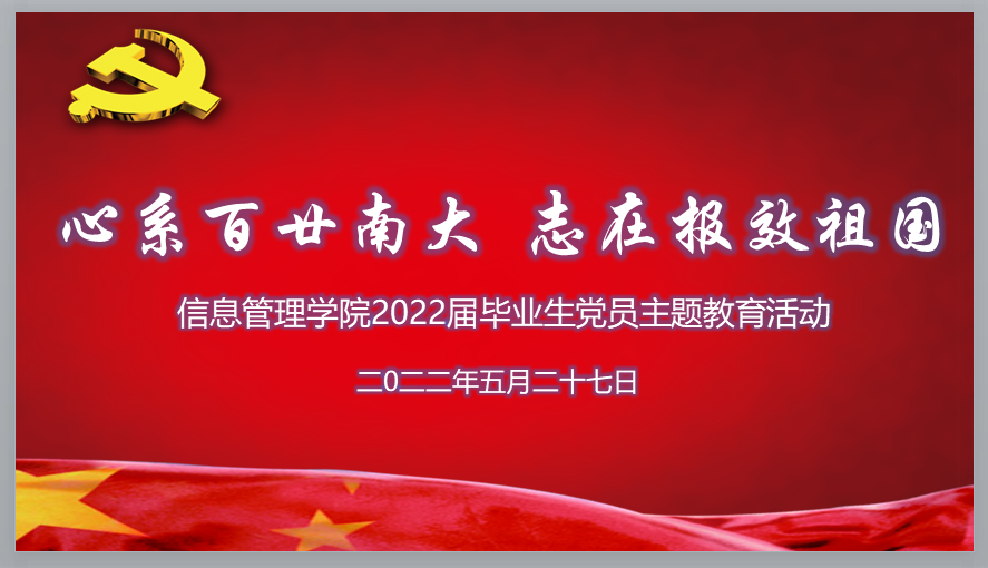 党委以“心系百廿南大 志在报效祖国”为主题举办2022届毕业生党员主题教育活动。学院党委书记姜迎春,党委委员、研究生辅导员刘千里,党委秘书、专职组织员朱敏及全体2022届毕业生党员参加活动。活动由学院党委副书记罗萍主持。