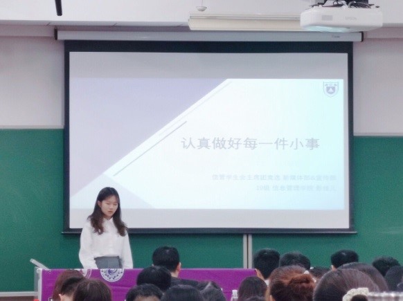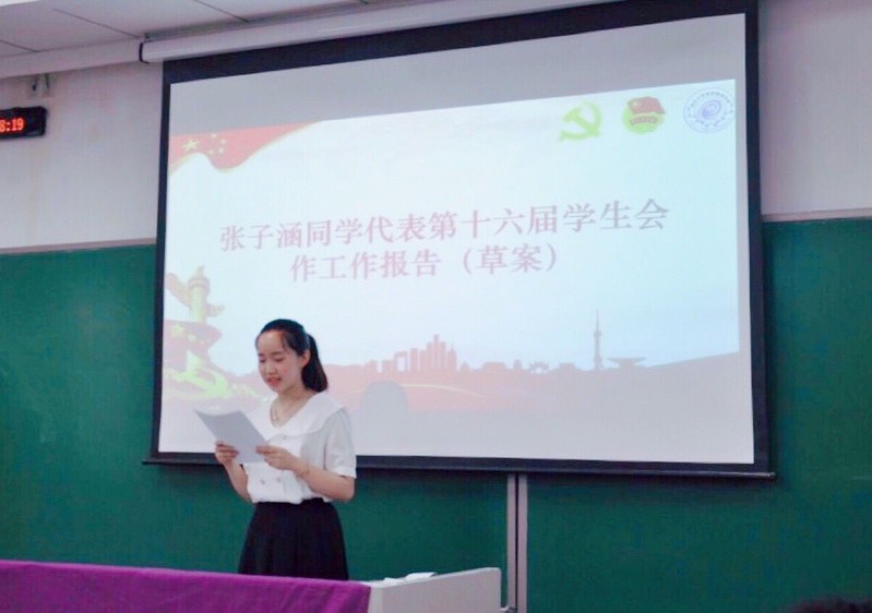 学生会主席张子涵同学代表第十六届学生会作题为《以人为本,做需求为先的服务者;凝心聚力,做温暖高效的同行人》的工作报告。