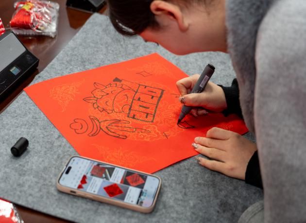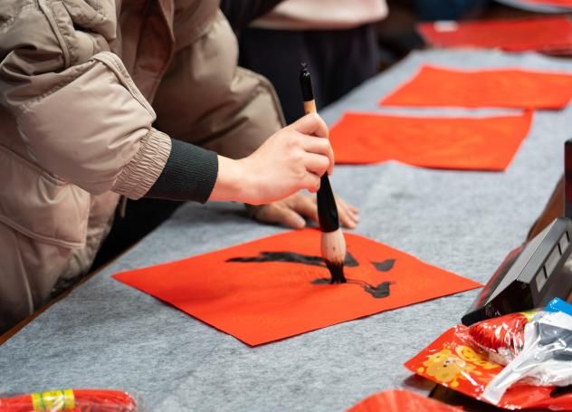 写福字环节墨香袅袅,案台上整齐摆放着毛笔、宣纸、墨汁与福字模板。无论笔墨功底深浅,师生们皆踊跃参与,凝神挥毫。同学们的笔法虽显青涩,却一笔一画饱含虔诚,不少同学还展开了随机创作,在纸上画出许多造型新奇的福字;老师们则从容落笔,笔下的“福”字工整端正,尽显雅致。层层叠叠的红纸上承载着满满的新年祈愿,暖意与墨香交织成最动人的年味图景。