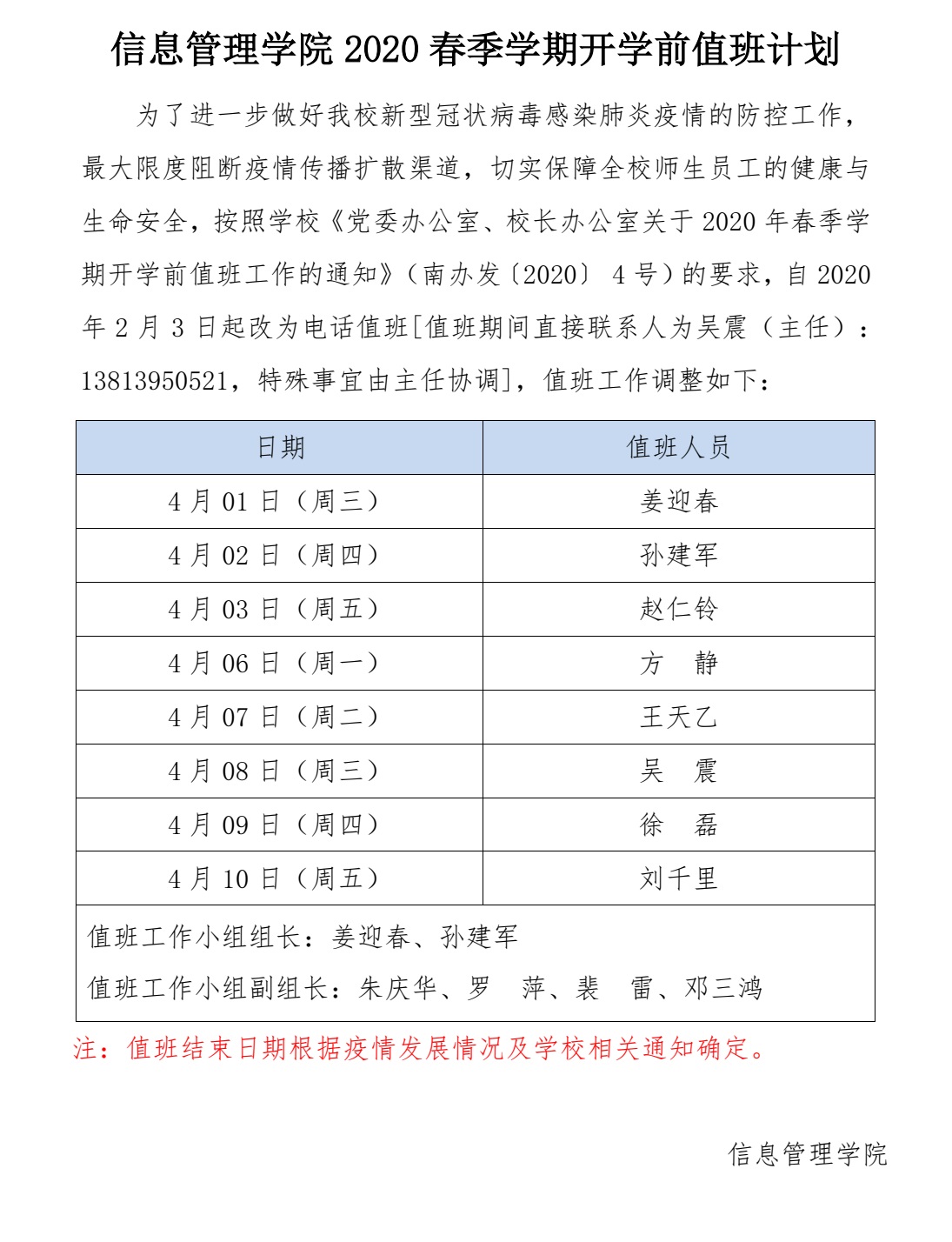 肉番 2020春季学期开学前值班计划(4月份)