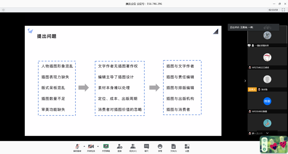 程锦、谭玓、陈楠等38名出版专业应届毕业生一一汇报了各自的毕业论文。这些论文主题涉及“文艺类出版机构IP运营”、“网络文学生产机制”、“日历书出版”、“大众出版的智能化转型”、“民营书店品牌运营”、“出版机构短视频运营”、“大学出版社高质量出版”、“人工智能与少儿出版”,“豆瓣阅读女性题材小说出版”,等等。