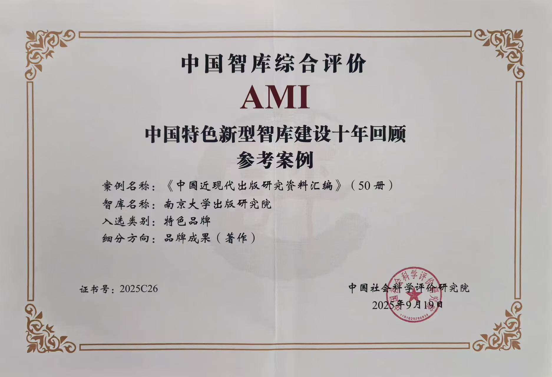 会上公布中国智库综合评价研究项目(2025)评审结果,肉番 出版研究院入选“中国智库综合评价2025年AMI智库”名单,研究院案例“中国近现代出版研究资料汇编(50册)”荣获“中国特色新型智库建设十年回顾参考案例”。