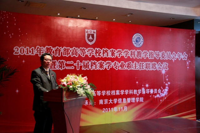 副校长杨忠,国家档案局教育处处长刘剑波,江苏省档案局副局长顾祖根,中国人民大学副校长、档案学教指委主任委员冯惠玲与会并讲话。