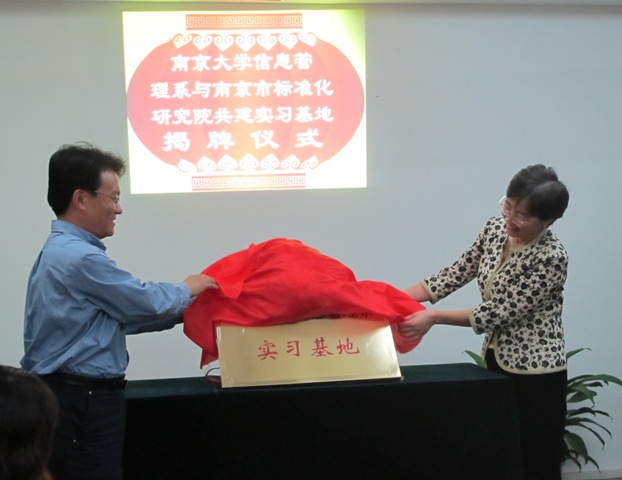 信息管理系实习基地揭牌仪式在南京市标准化研究院举行。信息管理系主任孙建军、党委书记江莹、党委副书记戴咏梅、南京市质量技术监督局副局长周黎丽、南京市标准化研究院院长汪浩等出席了此次仪式。孙建军主任和汪浩院长共同签订合作协议书。