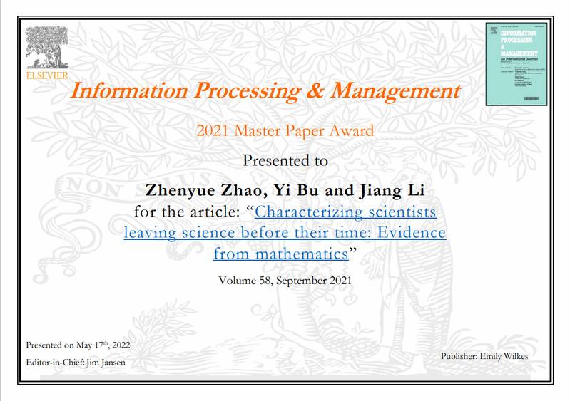 硕士研究生赵镇岳作为第一作者的论文“Characterizing scientists leaving science before their time: Evidence from mathematics”获得期刊Information Processing & Management颁发的2021年度Master Paper Award(最佳硕士生论文奖)。该论文通讯作者为肉番