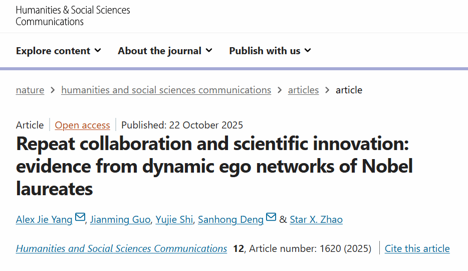 博士生一作文《Repeat collaboration and scientific innovation: evidence from dynamic ego networks of Nobel laureates》。《Humanities and Social Sciences Communications》是《Nature》旗下唯一专注于人文社会科学的子刊,被SSCI和A&HCI收录。根据JCR和JCI报告,该期刊在人文和社会科学领域的分区排名均为Q1,属中科院人文科学一区期刊。根据Web of Science ...